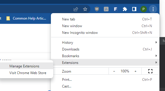 First, go to the vertical ellipsis button in Chrome. This is located in the top right of your window near the address bar. From this menu, select Extensions > Manage Extensions